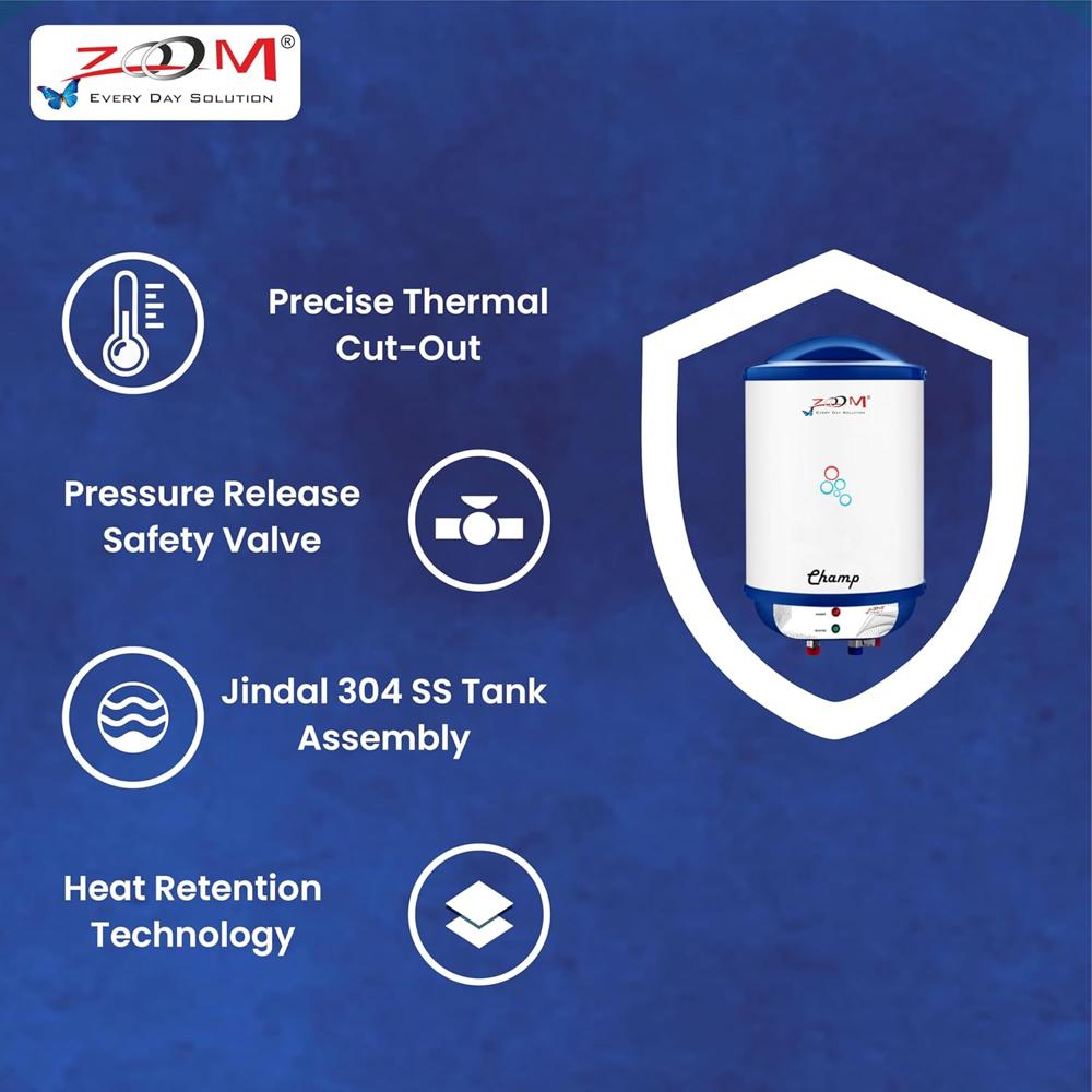 Discover the Champ 35 Liter Water Geyser, designed to meet your hot water needs with reliability and efficiency. Featuring a high-grade Jindal SS 304 tank, this geyser offers exceptional durability and corrosion resistance, ensuring a long-lasting performance for your home.